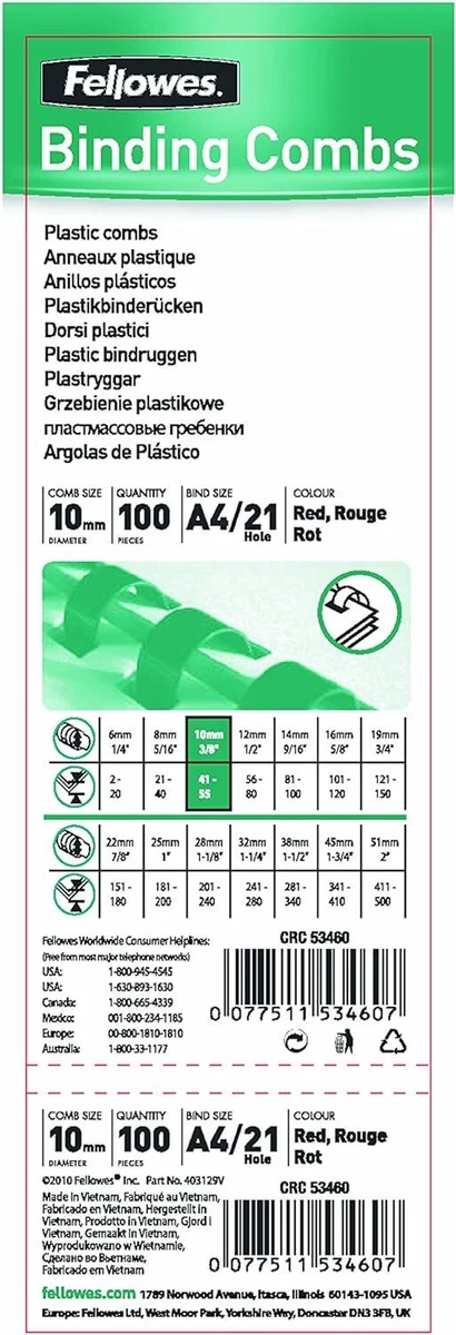 Fellowes 10mm A4 Plastic Binding Combs Black (Pack of 100) Black